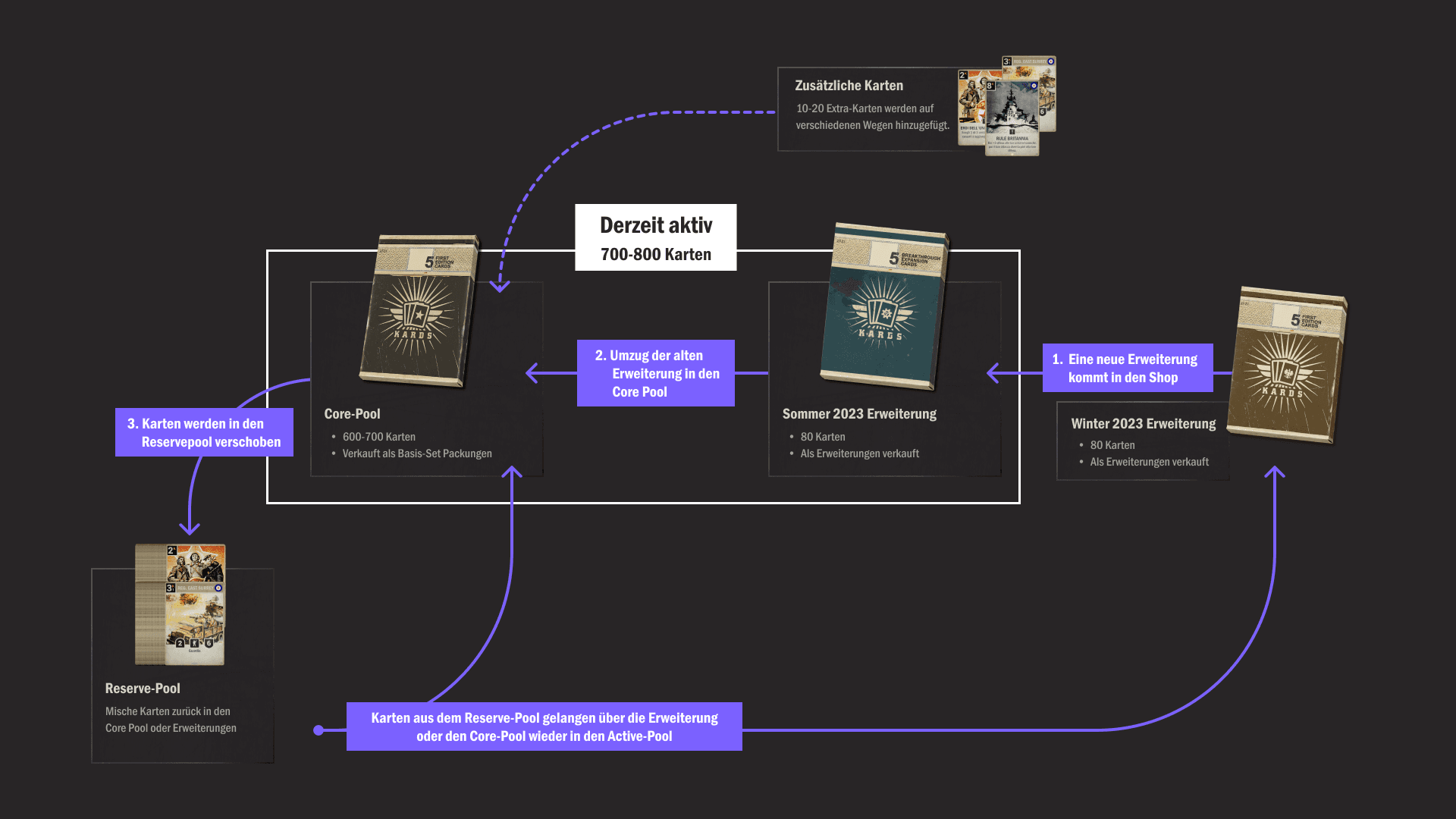 Für Spieler ist es wichtig die Sicherheit zu haben, neu erworbene Karten auch genießen zu können. Karten in neuen Sätzen sind daher für eine Weile von der Rotation ausgenommen. Nur Karten im Kernsatz gehen in den Reserve-Pool. Wenn ein Set in den Kern-Pool verschoben wird, dann geht keine seiner Karten in die Reserve. Bei der nächsten Rotation sind diese Karten dann auch sicher. Erst bei der zweiten Rotation, nachdem die Karten Teil des Kern-Pools geworden sind, können die Karten in die Reserve verschoben werden. Zum Beispiel, Legionen ist derzeit das neueste Set. Wenn die Sommererweiterung veröffentlicht wird, kommen Legionen-Karten in den Kern-Pool, aber keine von ihnen wird in den Reserve-Pool verschoben. Wenn die Winter 2023 Erweiterung live geht, werden Legionen-Karten immer noch nicht berührt. Erst mit der ersten Erweiterung 2024 können Karten im Legionen-Set in den Reserve-Pool gehen. Das bedeutet, dass Karten in der Sommererweiterung auf jeden Fall bis zur zweiten Erweiterung von ‘24 spielbar sein werden. Ausnahmen können in extremen Fällen gemacht werden, aber wir sehen nicht, dass wir dies oft (wenn überhaupt) tun müssen. Um diesen Prozess etwas besser zu verstehen findet ihr hier ein Diagramm für euer Sehvergnügen: