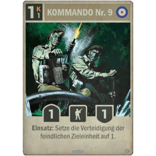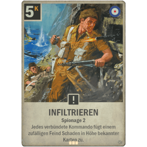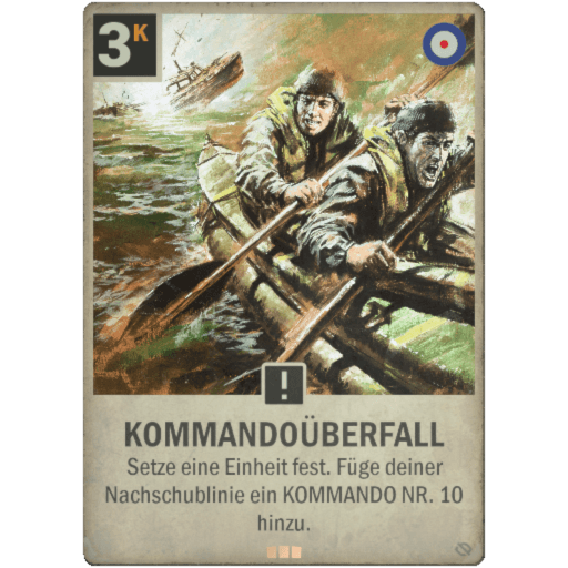 Britische Kommandos spielten eine entscheidende Rolle beim Sieg in Europa. Traditionelle Kommando-Decks verwenden Kommando Nr. 10 und eine Fülle von Befehlen, um zum Sieg zu fahren, wobei Crusader Mk II die Zugkraft bereitstellt. Die neue Erweiterung bietet Spielern mehr Möglichkeiten, Kommandos Nr. 10 zu erhalten, und eine neue Methode, um durch Infiltrieren zu gewinnen.