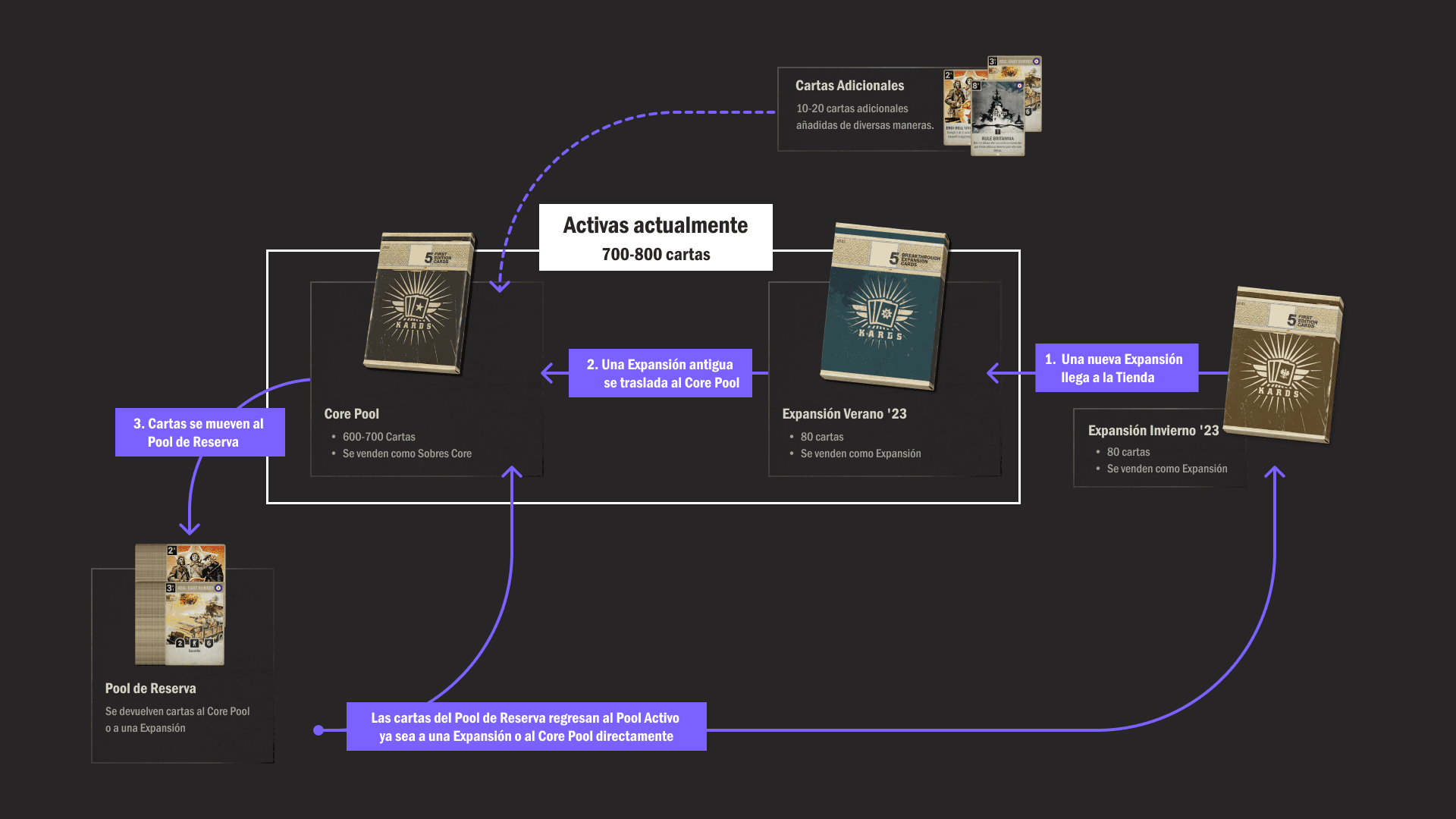 Una cosa que es muy importante es que los jugadores confíen que tendrán tiempo para disfrutar de las nuevas cartas que compran. Por lo tanto, las cartas de los conjuntos nuevos estarán exentas de entrar en rotación por algún tiempo. Solo las cartas en el conjunto Core van al Pool de Reserva. Cuando un conjunto se mueve al Core, ninguna de sus cartas entra en Reserva. En la siguiente rotación, estas cartas también están a salvo. Es solo en la segunda rotación después de que las cartas comenzaron a ser parte del Core que las cartas pueden pasar al Pool Reserva. Por ejemplo, Legiones es actualmente el conjunto más reciente. Cuando salga la expansión de verano, las cartas Legiones pasarán a Core, pero ninguna de ellas pasará al Pool de Reserva. Cuando salga la expansión Invierno ‘23, las cartas Legiones aún no se tocarán. Es solo cuando la primera expansión del ‘24 salga que las cartas del conjunto Legiones pueden pasar al Pool de Reserva. Esto significa que todas las cartas de la expansión de verano se podrán jugar hasta la segunda expansión del ‘24 como mínimo. Se podrán hacer excepciones en casos extremos, pero no prevemos la necesidad de hacer esto a menudo (si es que alguna vez lo hacemos). Para entender un poco mejor este proceso, aquí hay un diagrama: