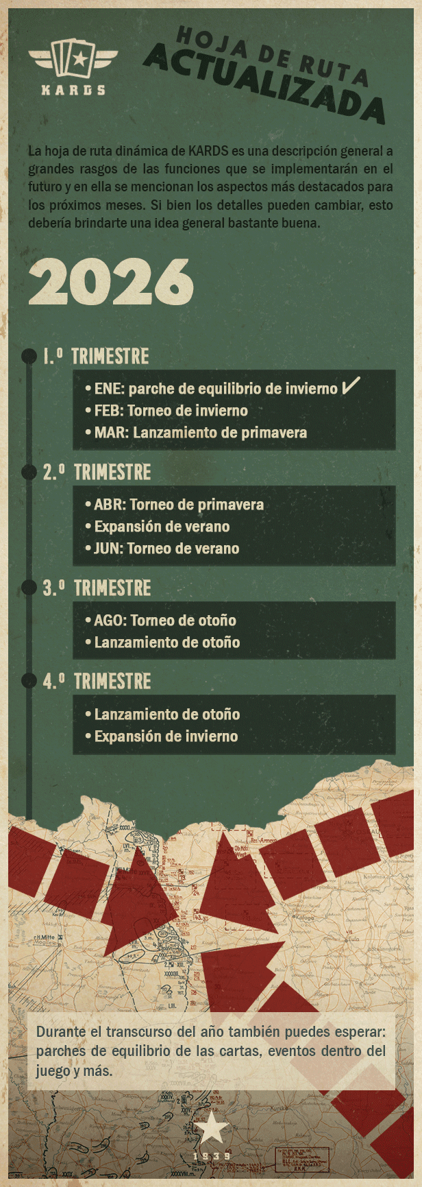 Tras el comienzo del 2026 es hora de un nuevo informe de inteligencia acerca de lo que KARDS tiene por delante. Esta actualización de nuestra hoja de ruta dinámica te ofrece una visión general de las operaciones clave que estamos planeando para el año.