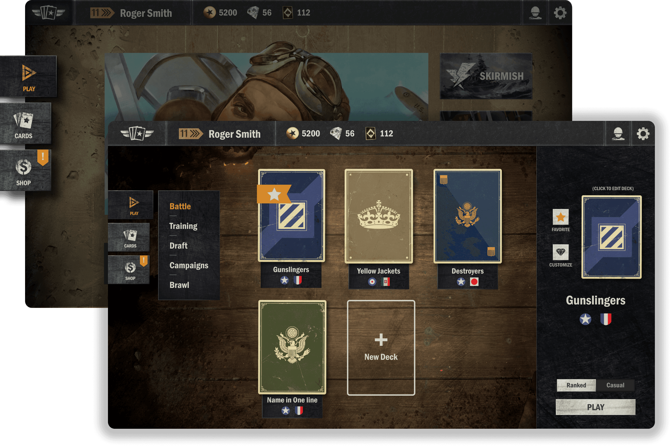 A partir de reflexiones propias, los comentarios de la comunidad y la ambición de que KARDS sea jugado durante muchos años más, nos hemos dado cuenta de que la interfaz de usuario de KARDS podría mejorarse. Al desarrollar la versión móvil del juego, vimos la oportunidad de revisar la interfaz de usuario, simplificarla y mejorar la experiencia general del usuario. La nueva interfaz de usuario estará disponible tanto en la versión para PC como en la versión móvil del juego, por lo que los jugadores tendrán una experiencia consistente más allá del dispositivo en el que elijan jugar. En este blog, les daremos una breve resumen de lo que pueden esperar de la nueva interfaz de usuario. Para obtener información más detallada, puedes consultar los blogs de los desarrolladores de nuestro Director Creativo Gummi: Nueva interfaz de usuario: Parte I - Pantalla de inicio de KARDS, Nueva interfaz de usuario: Parte II - Jugar, y Nueva interfaz de usuario: Parte III - Cartas.