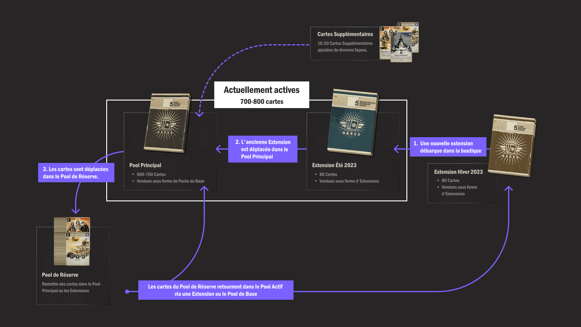 Si vous regardez à nouveau le schéma ci-dessus, vous remarquerez que les cartes peuvent également revenir du Pool de Réserve vers le Pool Actif. Une fois ce système mis en place, nous prévoyons de faire revenir environ 20 cartes (le nombre exact peut varier) du Pool de Réserve à chaque rotation (à chaque fois qu'une nouvelle extension sort). Bien sûr, cela ne se produira pas lors de la première rotation, car le Pool de Réserve sera quasiment vide à ce moment-là (voir ci-dessous pourquoi seulement « quasiment »). Mais à partir de l'extension Hiver 2023 et par la suite, un certain nombre de cartes reviendront de la réserve. Ce nombre sera nettement inférieur à celui des cartes qui entrent dans le Pool de Réserve, de sorte que celui-ci augmentera au fil du temps. Cela signifie que toutes les cartes ne reviendront pas du Pool de Réserve. Le but visé est de faire revenir du Pool de Réserve des cartes décisives à chaque rotation, de préférence celles qui correspondent au thème général de l'extension qu'elles accompagnent.