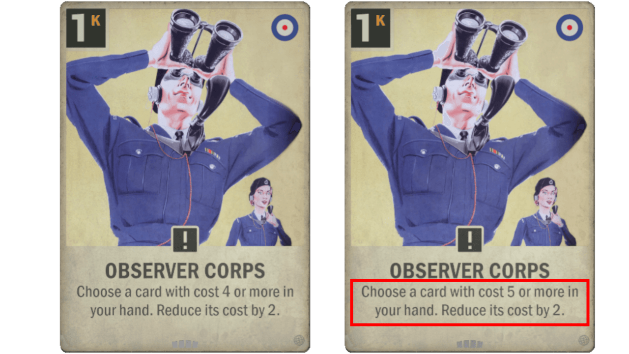 The Observer Corps played a critical role for the RAF in WW2, providing key intel for intercepting enemy formations. In KARDS, the OBSERVER CORPS is currently serving as a key component in Kredit Denial decks, becoming very powerful when combined with cards such as SOUTHERN PLAN and DAYLIGHT BOMBING. To address this strong combo, we're adjusting OBSERVER CORPS to reduce a card in hand with cost 5 or more, as opposed to the old 4 or more, by 2. While still a strong card, this adjustment will have a significant impact on its Kredit Denial combo, as well as keeping its power in check for potential future OTK combos.