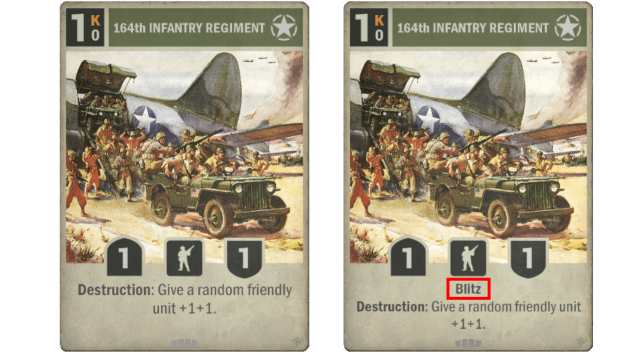The 164th Infantry Regiment was a unit that saw fierce fighting in the Guadalcanal Campaign providing significant experience in jungle warfare. This is a unit we feel could use a bit more oomph in KARDS to make it more useful in decks such as US Frontline. As such, we are adding Blitz to this unit, which will better represent its prowess in combat and allow for an increased presence in popular decks.