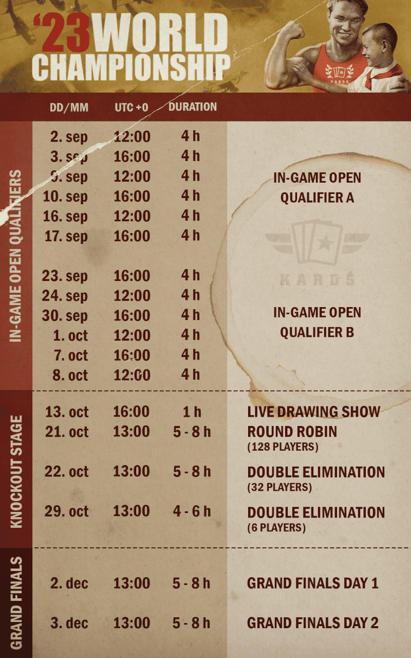 라운드 로빈 그룹 스테이지는 10월 21일에 개최되며, 32인 더블 엘리미네이션 라운드는 10월 22일에 개최됩니다. 더블 엘리미네이션 라운드의 상위 6인은 10월 29일 아이슬란드에서 열리는 그랜드 파이널에 진출할 상위 4인의 선수가 누구인지 가리는 생중계에서 맞붙습니다. 선수는 녹아웃 스테이지의 각 섹션에서 덱을 변경할 수 있습니다. 아래에서 전체 일정을 확인하세요.