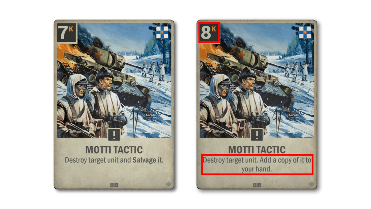 The clever Motti tactic served Finland well during World War II, but its performance in Kards has been rather lackluster. In addition, same as with Mobilize above, Salvage is not part of the permanent pool. The card retains its functionality for the most part, but getting a full fledged copy of the destroyed unit is significantly stronger than a salvaged copy, even with the additional cost.