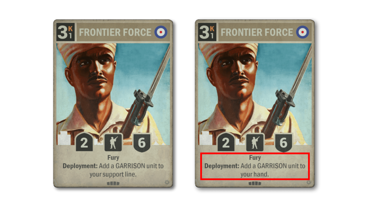 In the epic saga of Buffs, there was always a trusty sidekick lurking in the shadows. A sidekick so potent that it saw play as second fiddle in various other decks, mainly Ger-Brit midrange strategies. We are leaving its stats alone, so the option for imposing links to Chain Home or HMS Formidable are still very much on the table. But the Garrison unit now being added to hand rather than the battlefield gives the enemy a lot better opportunities to answer the Frontier Force before it can become a threat. The upside is that the Garrison in hand can be used to trigger for instance Forward Observers, but as the age-old saying goes - one Garrison in play is better than two in hand.