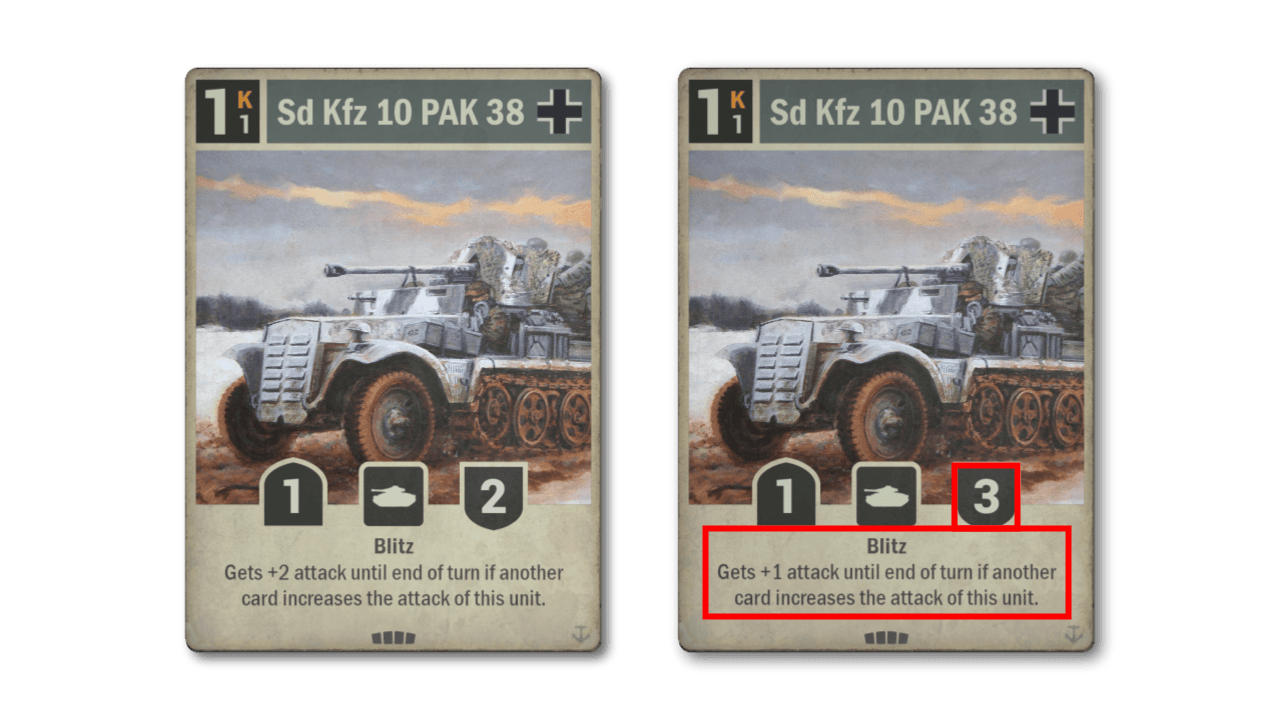 New: Blitz. Gets +1 attack until end of turn if another card increases the attack of this unit.