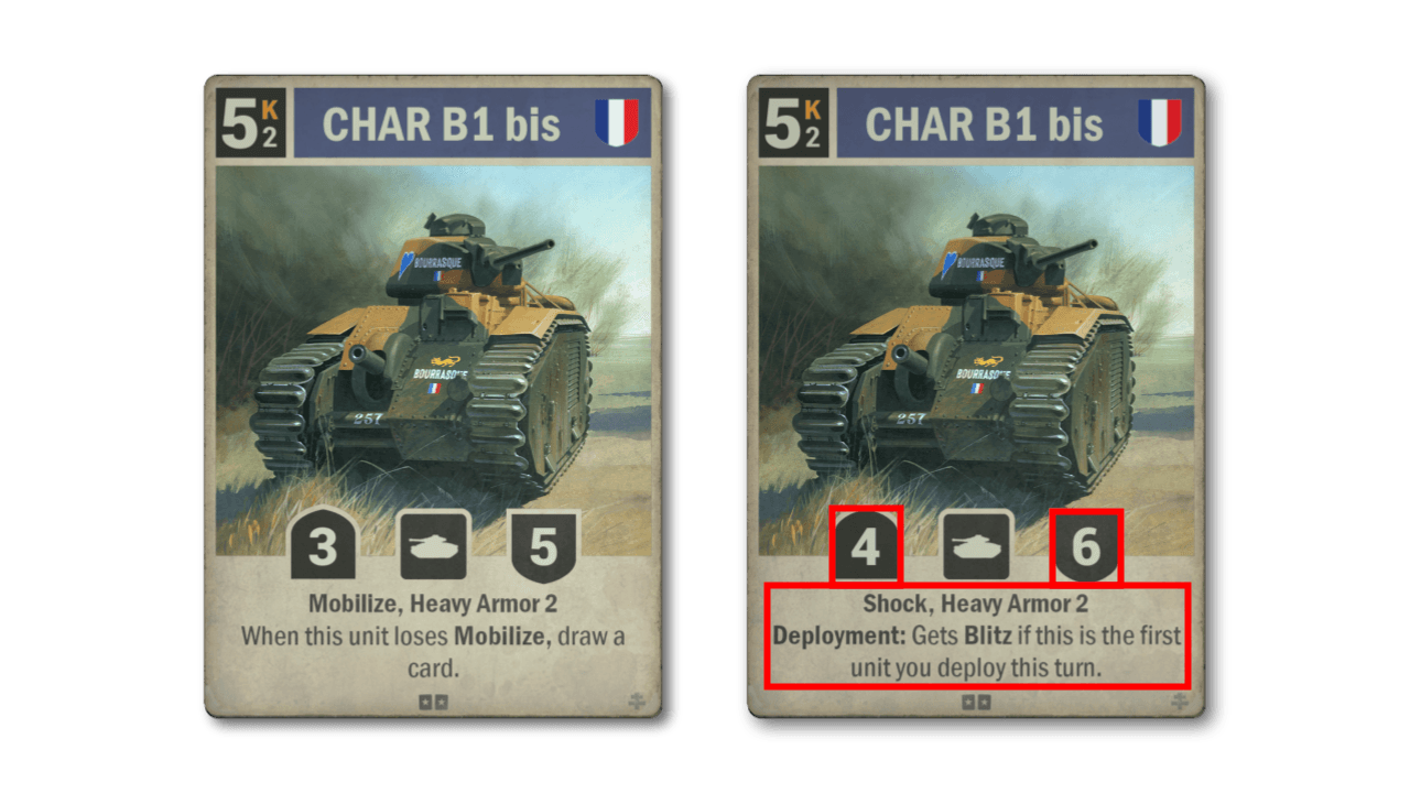 Now we come to the first of the two cards changing because of them becoming part of the permanent pool. Mobilize is not part of said pool, but we wanted to include this iconic tank, so changes are in order. It is now part of the “first unit deployed” theme of France. Strong stats plus the combination of Shock and Blitz makes this a powerful inclusion in mid-range or control decks, though only time will tell if we see it charging into the meta.