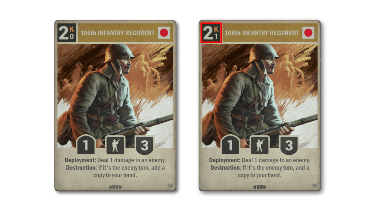 The final nerf of the April patch hits the hotfix hotpants fox itself, the 106th Infantry Regiment. Since its inception it quickly became the most desirable belle of the ball in most Japan-based decks. It has many strengths, one of them being the ability to contest the frontline with no cost, meaning their powerful ability became more of a problem for the enemy. So the nerf may seem slight, and make no mistake, the 106th will still be a very strong card, but the 1 operation cost makes the card a lot worse at fighting over the frontline, especially in the early turns of the game when it matters most.