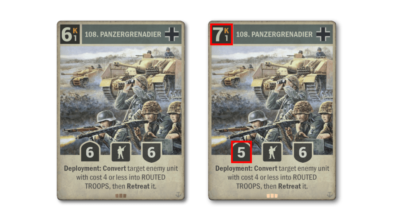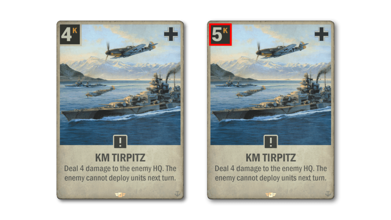 The KM Tirpitz was a bit too efficient at 4k, so we are moving it to 5 while retaining its effects. It is still a potent threat, but it is now harder to maintain a strong tempo with it. Whether the increased cost will lead to the card sinking remains to be seen, but don’t be surprised if it remains afloat.
