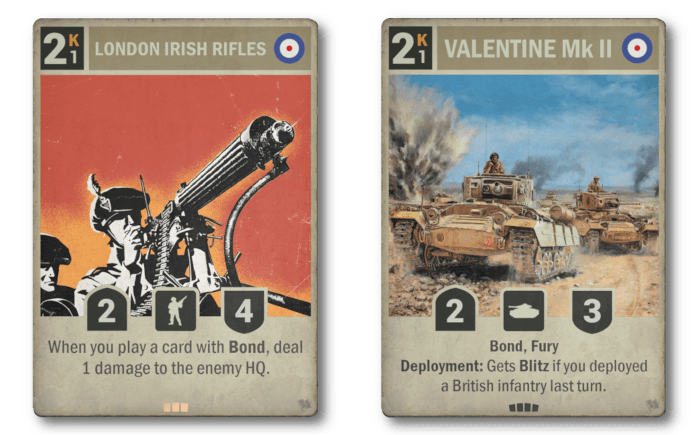 The LONDON IRISH RIFLES deals one damage to the enemy HQ each time you play a card with Bond. The VALENTINE Mk II not only carries Bond, triggering that effect, but also gains Blitz on deployment if you played a British infantry last turn. Combined with its Fury ability, allowing it to attack twice, this duo packs a serious punch.