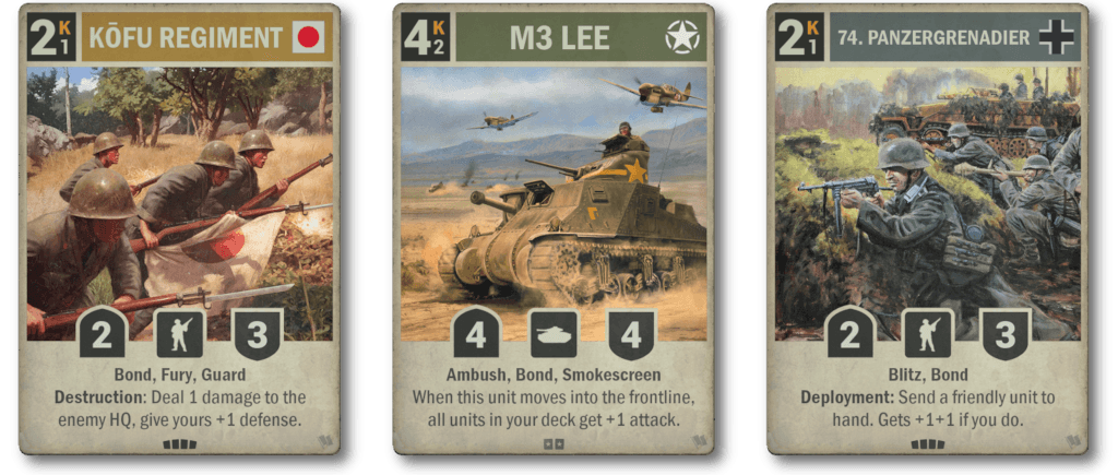 Meanwhile, cards such as the KOFU REGIMENT, M3 LEE, and 74. PANZERGRENADIER, offer powerful effects if you can manage the risks that come with divided forces. These units reward disciplined deck-building and precise timing, where cohesion determines whether a play turns the tide or falters under pressure.