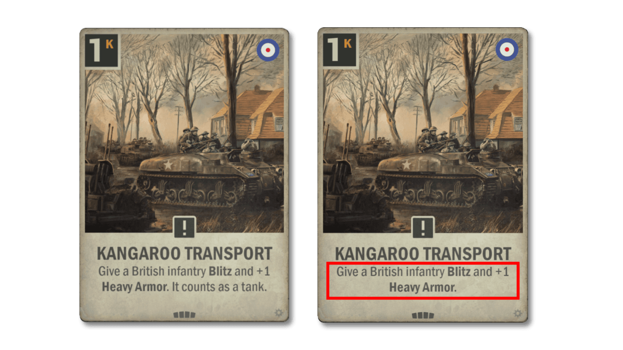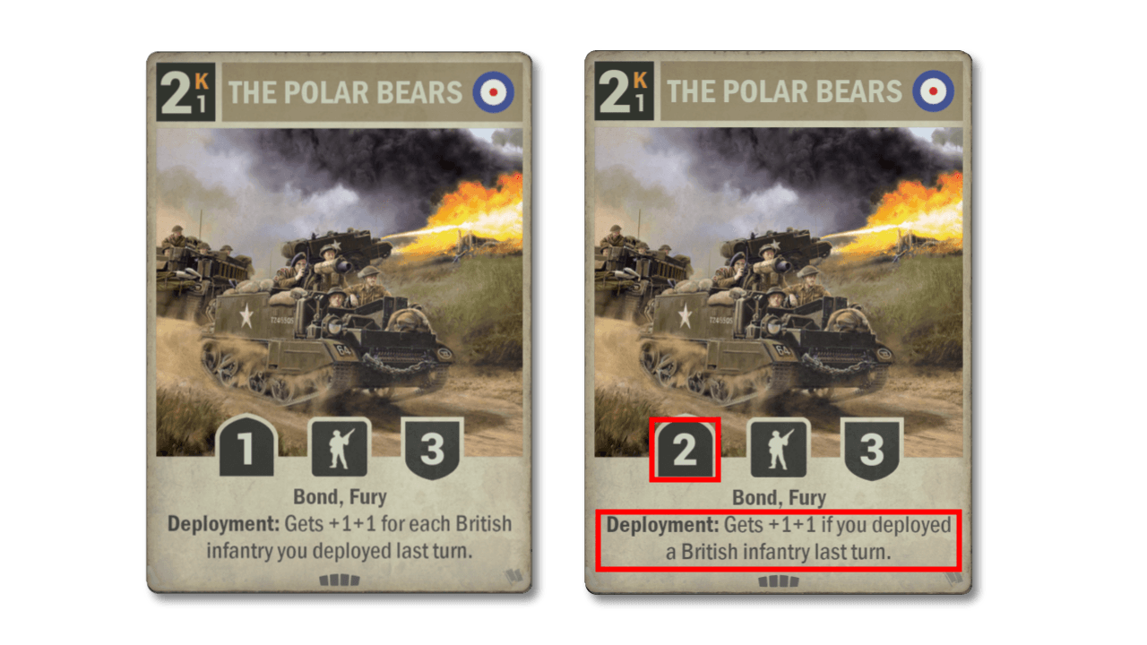 The British sub-theme of triggering effects if you deployed a British infantry on the previous turn has seen some success, mainly through the new Valentine and Forward Observers. The Polar Bears however are not part of that success and have struggled seeing play. We are streamlining the effect a bit, the text now reads the same as on the other cards in this sub-theme. To compensate it now has 1 higher base attack. It is a bare speculation that the Bears will bear arms into more future battles, but if they do, then beer all around.