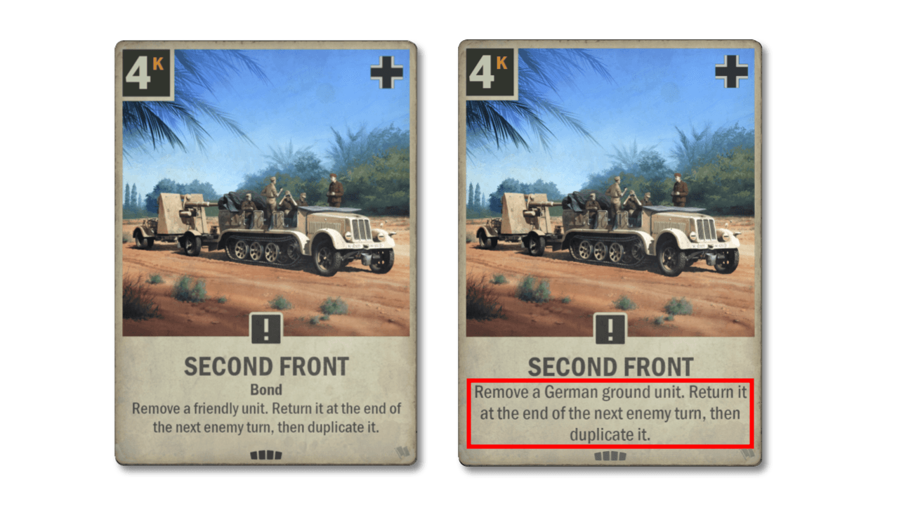 New: Remove a German ground unit. Return it at the end of the next enemy turn, then duplicate it.