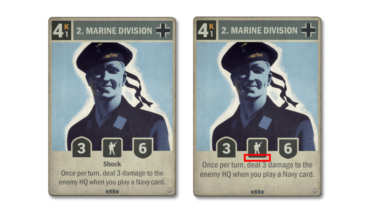 We were intentionally very careful with the bounce/remove from battlefield themes of Germany and Japan in Homefront, as such strategies can quickly become very frustrating to face. While we do not want to see these strategies in Tier 1 decks, we still want to support them enough to be viable. With that in mind we are improving one of the cornerstone cards in this strategy in 40. Panzergrenadiers. Its deployment effect is very powerful, but its stats were a little bit lacking. Now that it carries a bigger threat it should bounce into more decks.