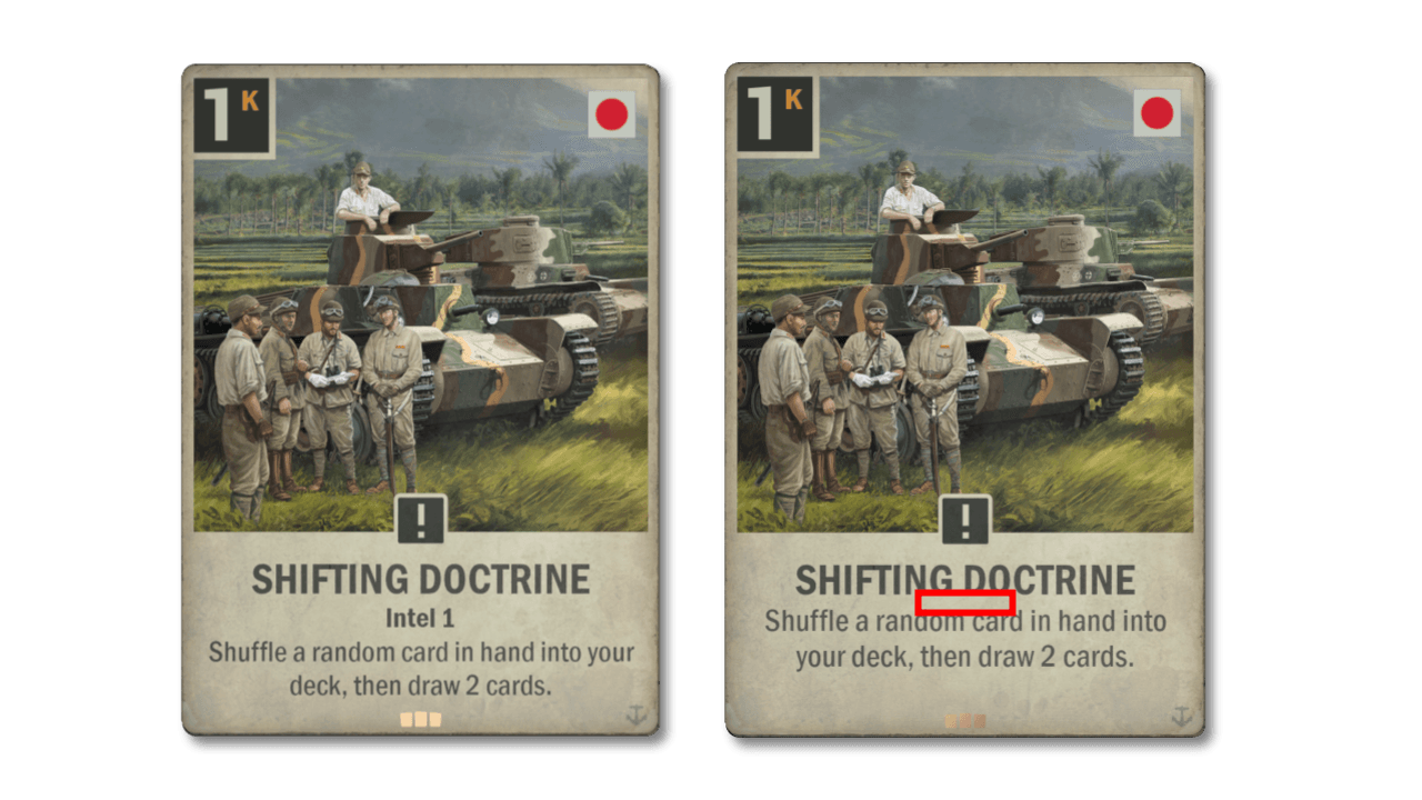 Another couple of decks chomping at the bits at the downfall of Second Front are Jintel and Shuffle. In both these decks, Shifting Doctrine plays an important role, so we are preemptively nerfing these strategies by removing the Intel 1 from it. This mainly hurts Jintel, but on the whole the card is significantly weaker now so we will see if players will shift away from intel and/or shuffle doctrines in the future.
