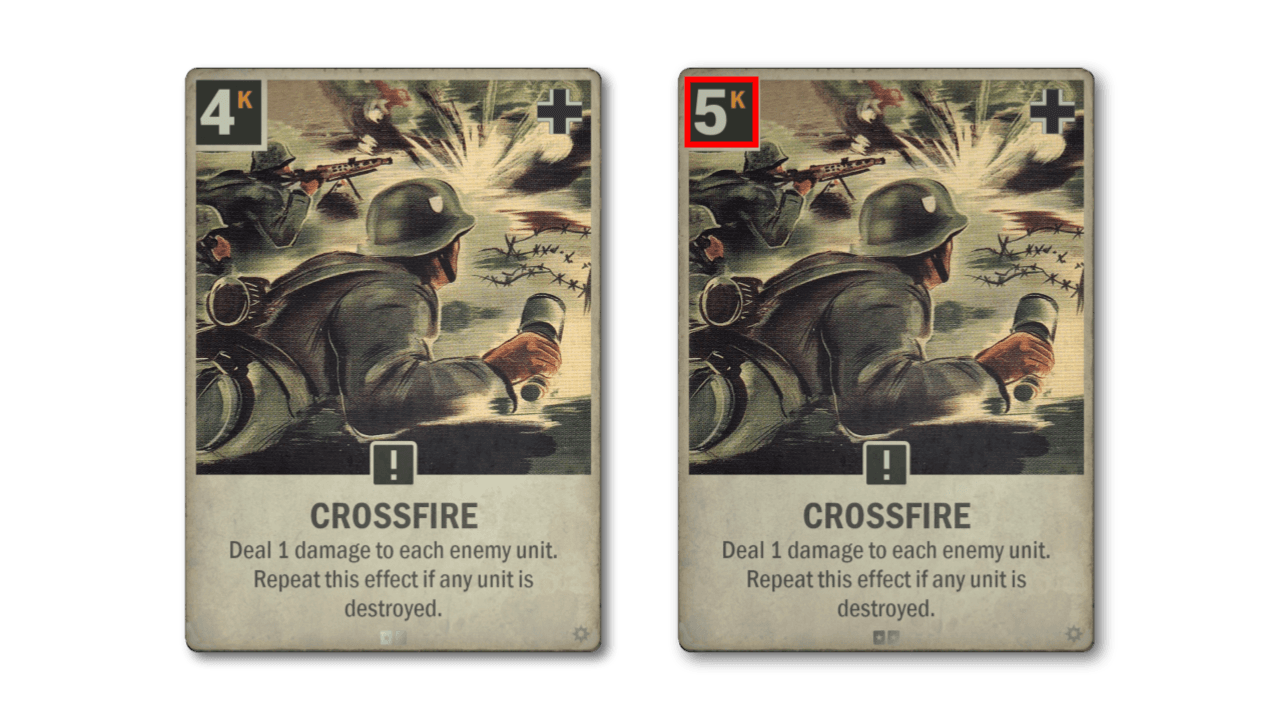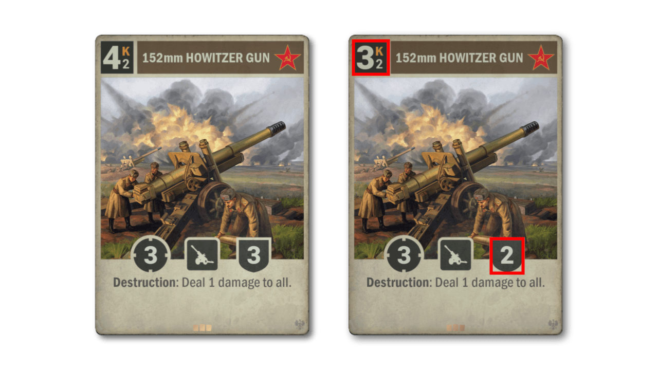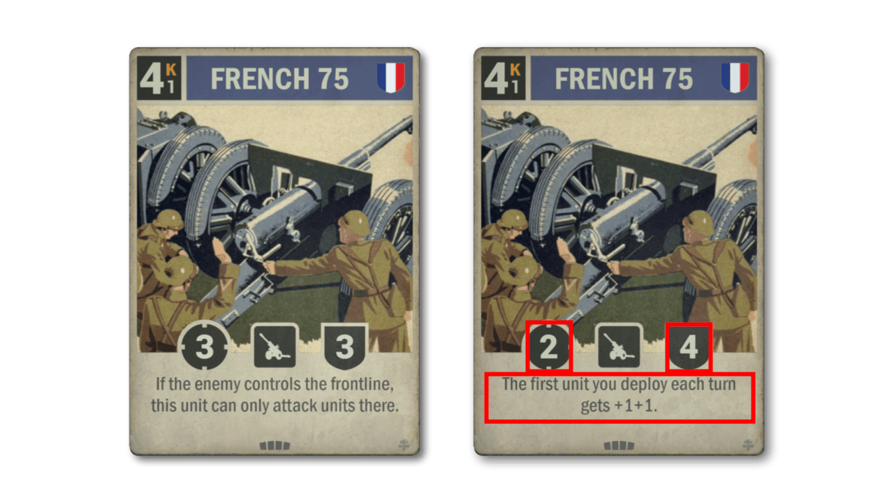 French cards have had a good success rate in finding their way into meta-relevant decks. French 75 is not one of them. While it has decent stats for an artillery, its debilitating ability has no fit with existing French strategies, not to mention removing the whole raison d’être for artillery. The new version fits better into what France is about, and while it hits less hard now, it also has better staying power.