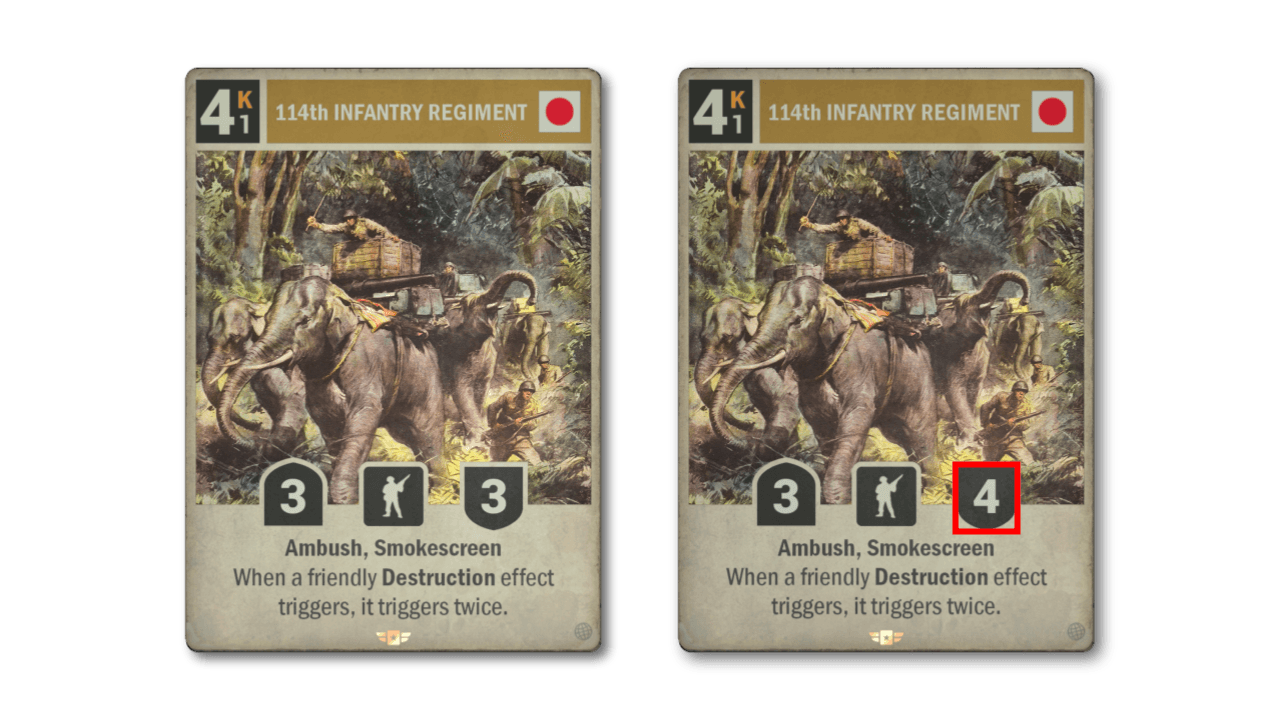 Speaking of destruction effects, for destruction-based decks, the 114th Infantry Regiment has always been the elephant missing from the room. Now that it has a bigger backside, it has a better chance of staying in the room for longer to wreak its destructive power.