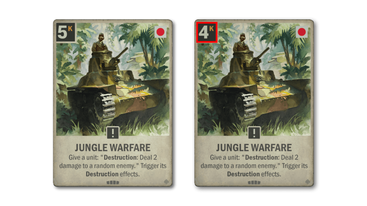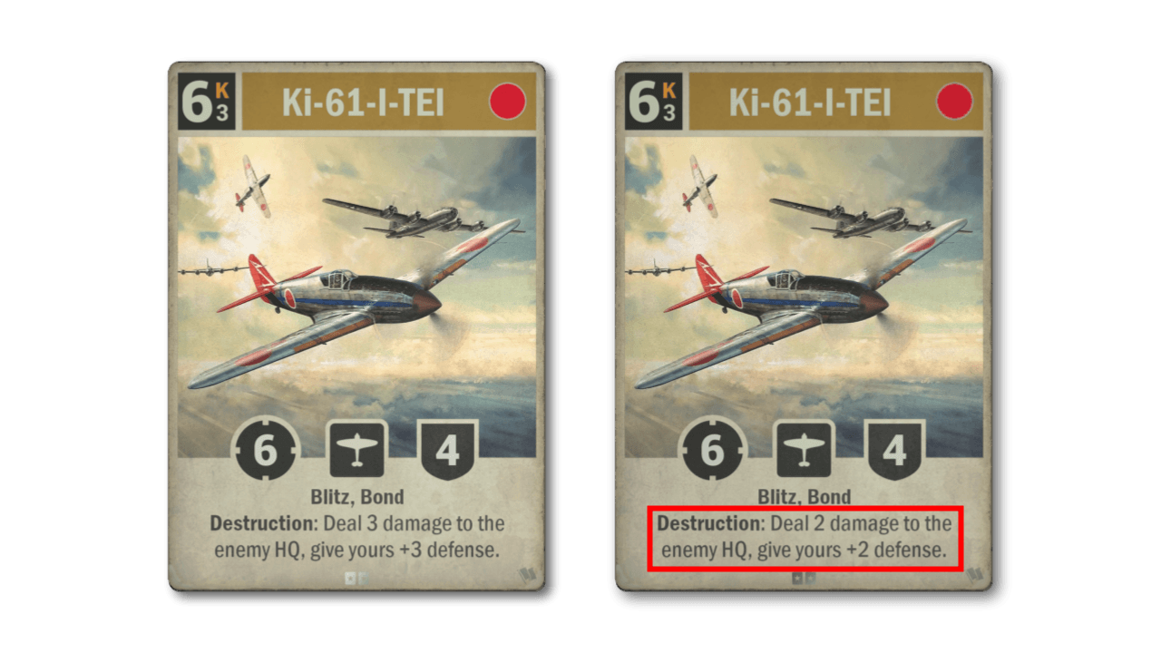 The final card seeing a nerf is the Ki-61-I-TEI. One of the best cards to come out of Homefront, the vacuum left by the Shiden being reserved ages ago, has finally been filled. Filled a bit too well if anything; the destruction effect on top of the big blitz fighter stats created a bit too much inevitability, so we are tuning the destruction effect down slightly.