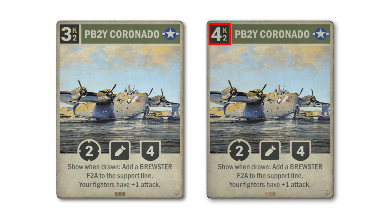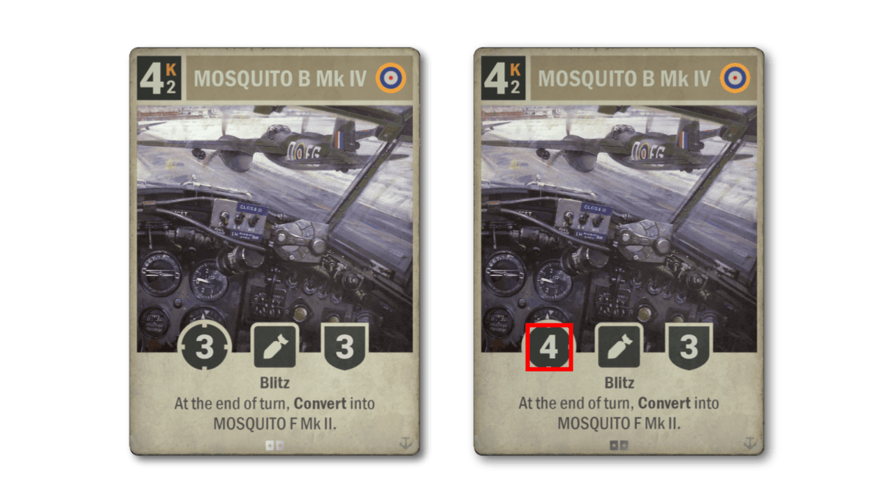 Britain is the least played major nation, though they have improved a bit over the last year. Still, the only really viable British decks are variations on Buffs. We feel there is room to push slower British strategies a bit, hence this improvement to the Mosquito bomber. The fighter variant stays the same, but the bomber variant packing a bigger punch certainly makes it more attractive.