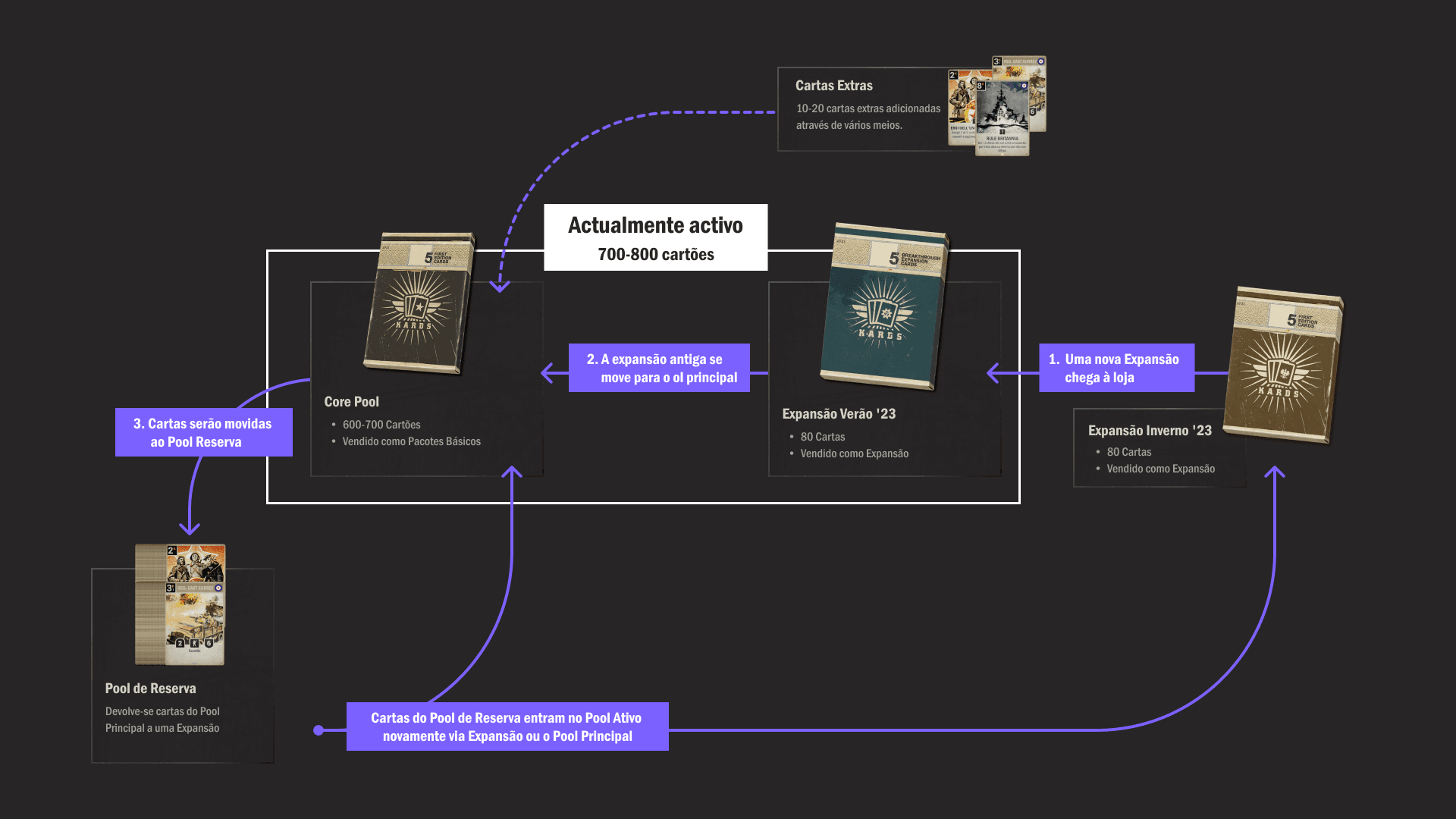 Em primeiro lugar, estamos simplificando a estrutura do conjunto atual. Isso tem dois benefícios. Uma delas é tornar a loja mais fácil e limpa para os jogadores (especialmente os novos) navegarem e entenderem, especialmente com o plano de lançar novas expansões regularmente. A segunda razão, que abordaremos em mais detalhes abaixo, é nos permitir controlar melhor o que fazer com cartas mais antigas à medida que o pool geral de cartas aumenta ao longo do tempo.