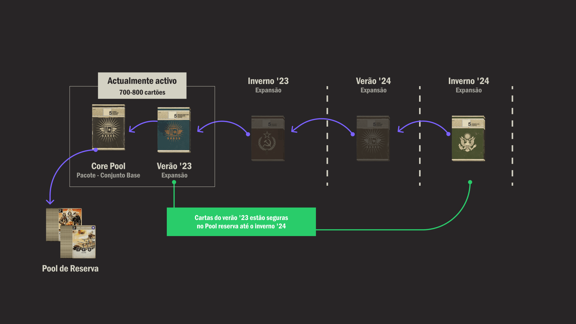Uma coisa que é muito importante é que os jogadores tenham fé em ter tempo para aproveitar as novas cartas que compram. Assim, as cartas em novos conjuntos estarão isentas de rotação por um tempo. Apenas as cartas no conjunto Core vão para a Reserva. Quando um conjunto se move para o Núcleo, nenhuma de suas cartas entra na Reserva. Na próxima rotação, essas cartas também são seguras. É somente na 2ª rotação após as cartas se tornarem parte do Núcleo que as cartas podem ser movidas para Reserva. Por exemplo, Legiões é atualmente o mais novo conjunto. Quando a expansão de Verão chegar, as cartas Legiões serão movidas para o Núcleo, mas nenhuma delas será movida para a Reserva. Quando a expansão Inverno ‘23 cai, as cartas das Legiões ainda não são tocadas. É somente quando a primeira expansão de ‘24 cai que as cartas no conjunto Legiões podem ir para a Reserva. Isso significa que as cartas na expansão de verão serão definitivamente jogáveis até a segunda expansão de ‘24, no mínimo. Exceções podem ser feitas em casos extremos, mas não prevemos a necessidade de fazer isso com frequência (se for o caso). Para entender esse processo um pouco melhor, aqui está um diagrama para o seu prazer de visualização: