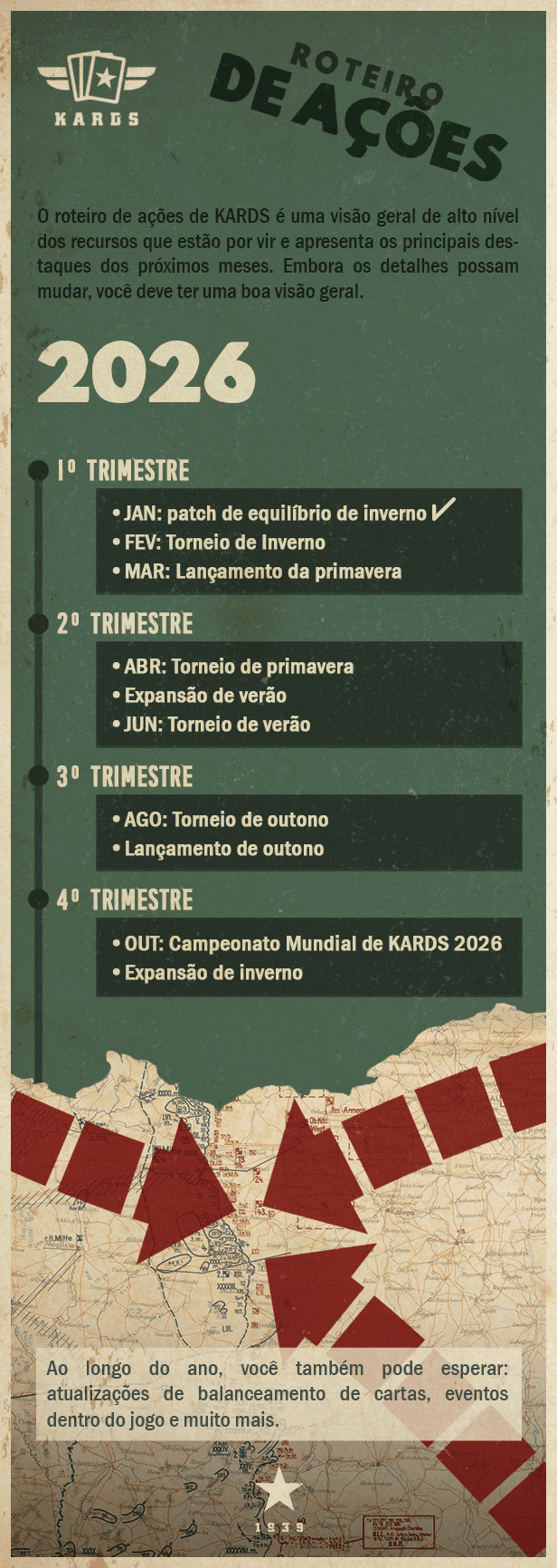 O roteiro de KARDS é uma visão geral de alto nível atualizada regularmente dos principais marcos de KARDS - O Jogo de Cartas da Segunda Guerra Mundial. Ele se concentra nos grandes pilares do ano: expansões, lançamentos sazonais e eventos de destaque, como torneios e o Campeonato Mundial.
