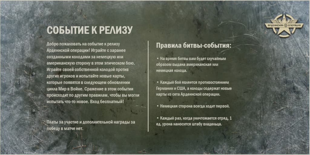 Это обновление цикла Мир в Войне включает 7 уникальных новых карт (всего 18). В премиум-версию также входят очень популярные альтернативные арты, новый немецкий штаб и поле битвы, золотые версии карт Арденнской операции, шлем медика в качестве нового предмета для стола и значительное количество джокеров всех редкостей.