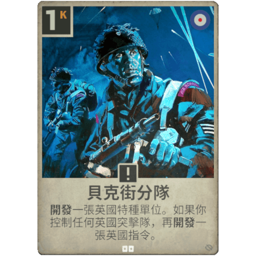 開發一張英國特種單位。如果你控制任何英國突擊隊,再開發一張英國指令。