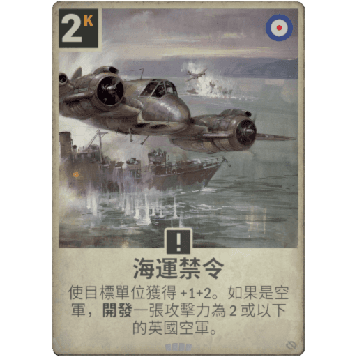 使目標單位獲得 +1+2。如果是空軍,開發一張攻擊力為 2 或以下的英國空軍。