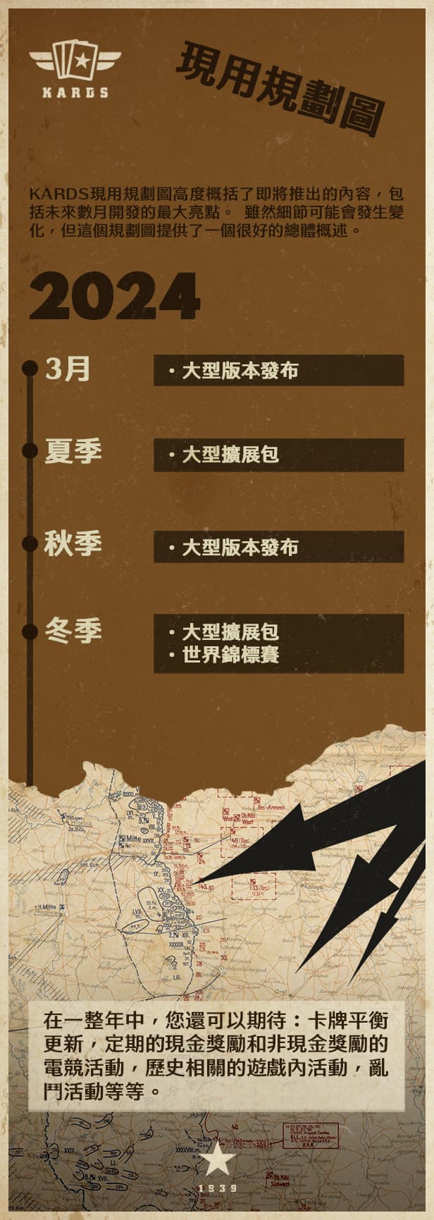 此規劃圖整體概括了我們為 KARDS 計劃的內容。在此期間,我們還將為您帶來許多較小內容、改進和活動。