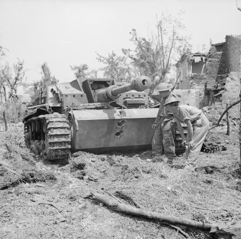 英軍士兵檢查被擊毀的德國三號突擊炮,卡西諾周邊,義大利,1944 年 5 月 18 日。來源:洛克林中士,第 2 陸軍影像部隊。