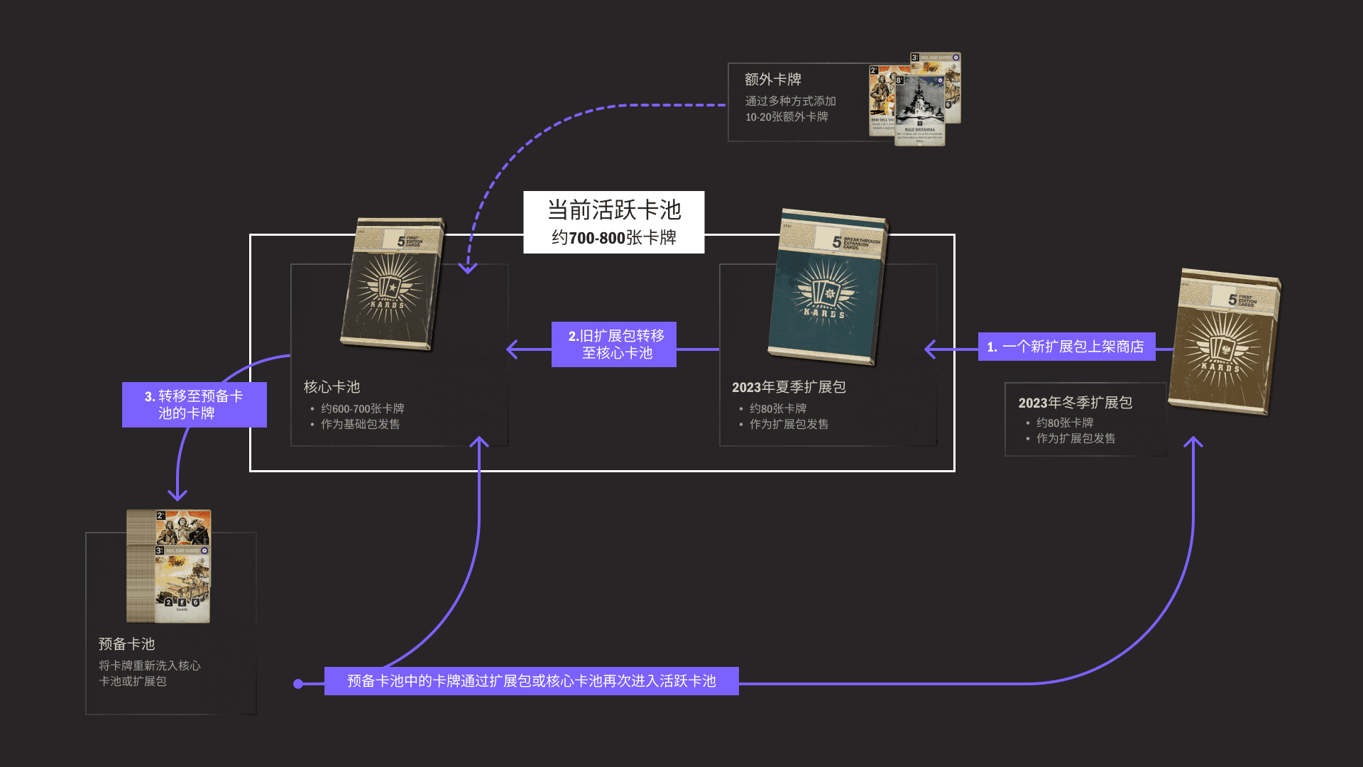 许多人可能会问,为什么我们不像大多数卡牌游戏那样,根据套装将卡牌轮换到预备卡池中。这将简化理解的过程,但会带来一些问题。两个主要原因,首先,这将使一些盟国基本上无法游玩,因为它们的大部分卡牌来自其引入的套装。其次,作为一个基于历史的游戏,我们在可用的单位类型方面受限——当一些标志性的单位轮换出去时,我们无法轻松地用同类替换。这可能意味着我们最终会得到一个没有任何Panzer或Spitfire的二战游戏,而这是谁也不愿意看到的!因此,出于这些以及其他原因,我们每次都会亲自挑选哪些牌会被转移到预备卡池。