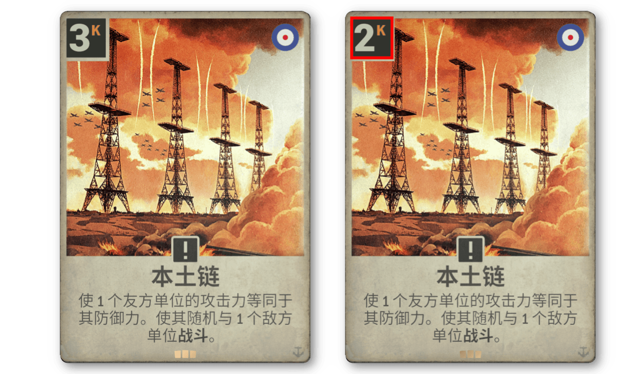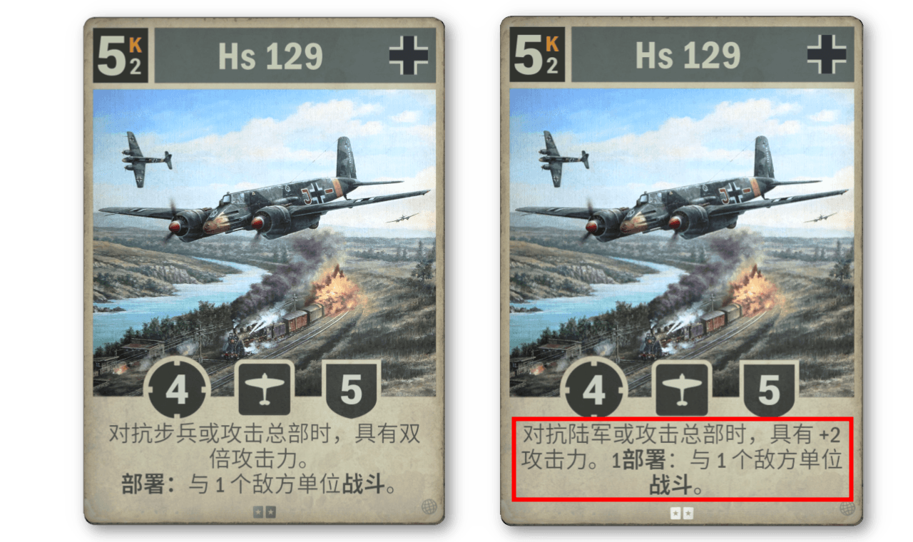 新:对抗陆军或攻击总部时,具有 +2 攻击力。部署:与 1 个敌方单位战斗。