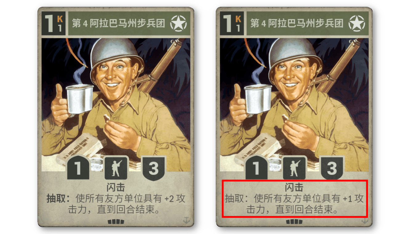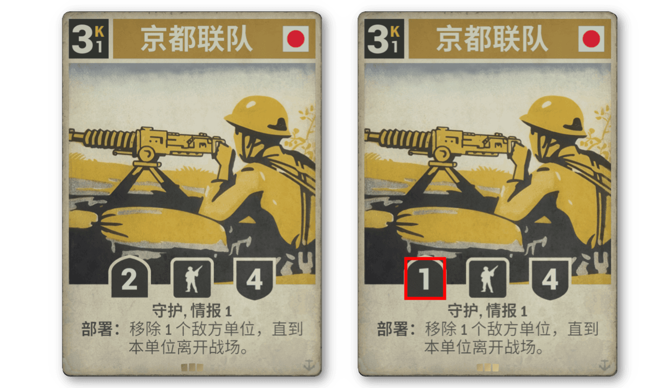 上文京都联队的片段有提到,即使是暂时移除单位,效果也十分强力,所以我们要立刻通过加强这张小解牌来产生自相矛盾的行为。否则这就不是对味的 1939 补丁了。暂时移除单位的效果目前看起来或许并不起眼,但没准在不久的未来,会变得更有价值。谁知道呢?