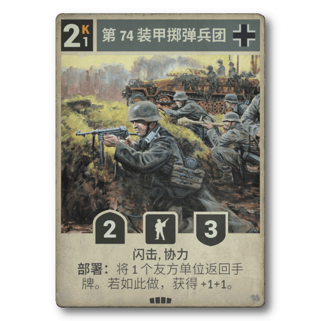 全新协力机制专注士气伤害(原疲劳减益)。使用协力卡牌时,除非回合开始时场上有相同国家的友方单位,否则总部会受到士气伤害。