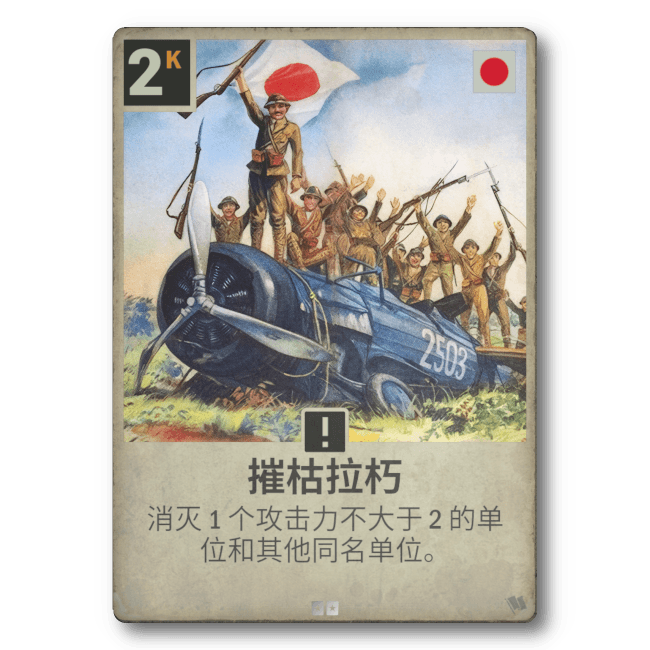 效果:单位不因消灭离开战场时,对敌方总部造成 2 点伤害,使友方总部获得 +2 防御力。
