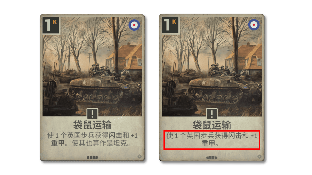 旧:使 1 个英国步兵获得闪击和 +1 重甲。使其也算作是坦克。