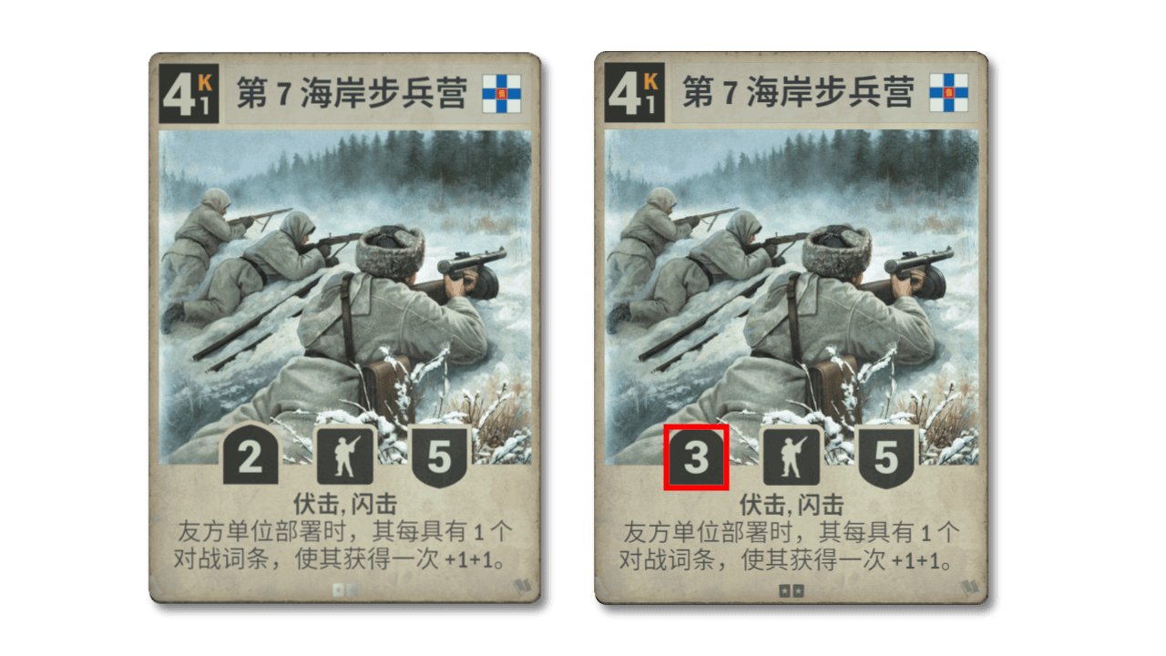 新:协力,奋战。部署:若上回合友方部署过英国步兵,获得 +1+1。
