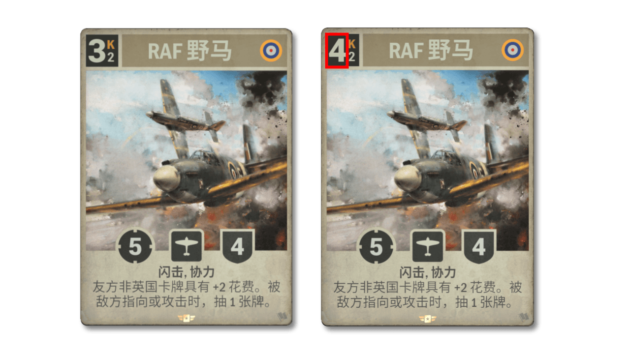 数值强势的 RAF 野马带有本家自肃,会使非英国牌更加昂贵。然而,在实战中,这点限制往往无伤大雅,因为它特别擅长快速结束对局。因此,我们已调整数值,把花费改成了 4。它依旧桀骜不驯,但斩杀能力不可同日而语。