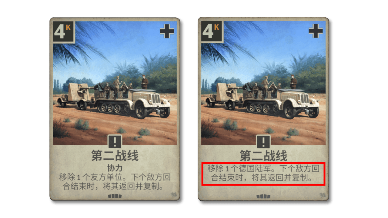 新版保留了强大的复制效果,单位仍在敌方回合入场,能够及时发挥作用。最大的区别在于缩小了使用对象的范围。德国有许多强力陆军,所以它仍有发挥空间,但 OTK 潜力将受到严重限制。请注意,它不再仅限友方单位,理论上也可以对敌方单位使用。第二战线能迎来第二春吗?这有待下回分解。