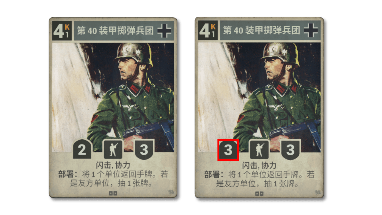 我们曾特意对德国和日本的回手/移除主题持谨慎态度,因为这类策略很容易令人心声厌恶。虽然不大希望看到它们跻身主流卡组之列,但我们仍打算给它们提供充分支持,以维持其卡组可行性。因此,我们将对其核心卡牌之一,第 40 装甲掷弹兵团,进行补强。。其部署效果十分强力,但身板略有欠缺。现在它具备了更大的威胁性,应该能出现在更多的卡组中。