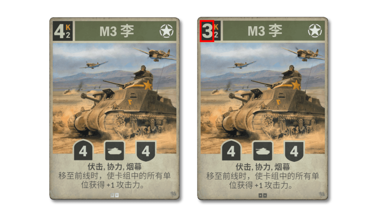 增益卡组单位的策略在 USS 沙利文兄弟号和专家步兵团等卡牌中成效有限。某种程度上来说,这类构筑曾饱受第二战线打压,现在有了更好的发展机会。尽管如此,事实证明 M3 李确实有点拖沓,为此我们降低了它的花费。这也能让它容易被其他卡组接纳,例如配合近卫机械化第 12 旅的四攻主题。